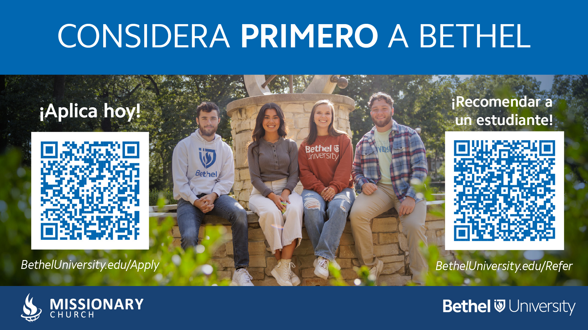 El domingo pasado fue el Día de Bethel, donde le alentamos a considerar a Bethel en primer lugar en su búsqueda de una universidad en la Iglesia Misionera. Vaya a BethelUniversity.edu para programar una visita, presentar una solicitud o recomendar a un estudiante hoy!
