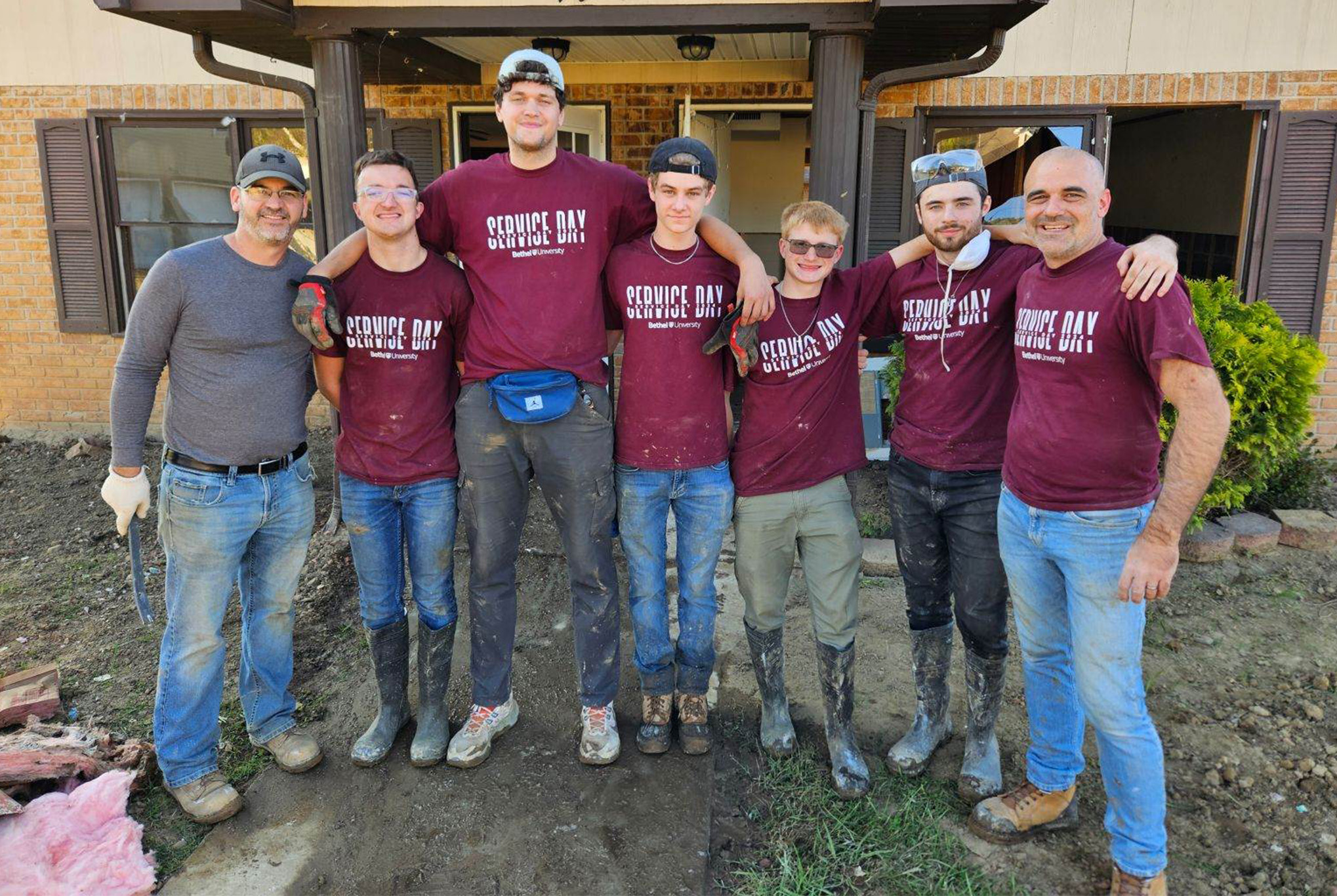 - The Bethel team stands in front of a townhouse they helped clear after Hurricane Helene. They are (left to right) church planter Ryan Vernon; Bethel students Owen Ransom, David Setka, Nathan Kropiewnicki, Abraham Guernsey, Zak Shaffer; and Missionary-in-Residence Jeremy Tice.